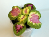 Окраска листьев: насыщенный розово-пурпурный центр с широкой зелёной каймой по краям. С возрастом оттенки становятся ещё глубже, особенно на ярком рассеянном свете.